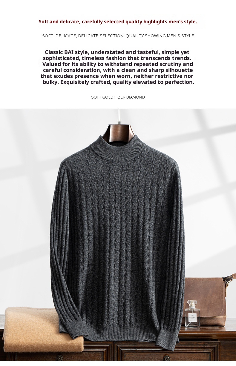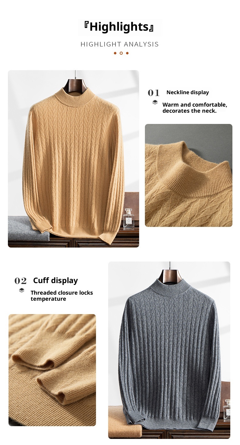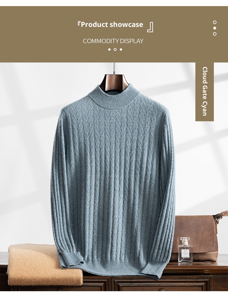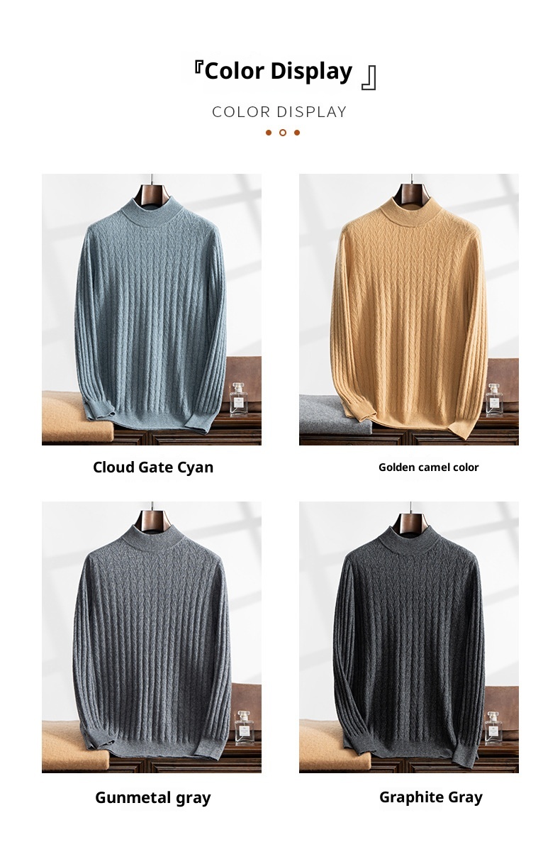 Thickened Wheat Jacquard Cashmere Sweater Men's Half-high Collar Solid Color Sweater